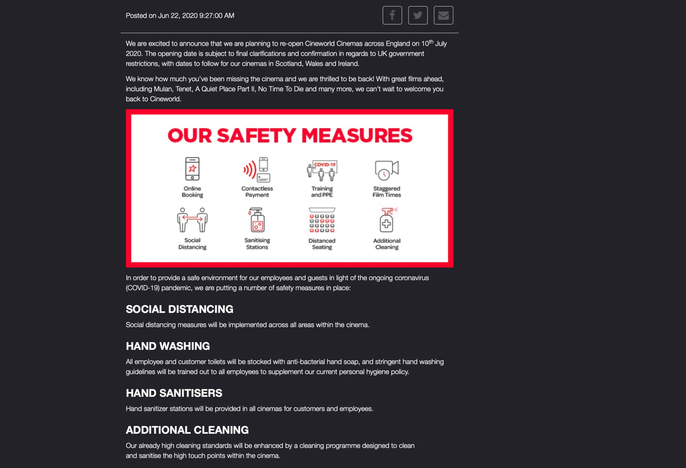 If you compare the Drafthouse page to, for example, the Cineworld one, you can see how crucial the difference is. I don't even live in the US and had never heard of Drafthouse before, but their COVID page makes me want to go there; the Cineworld page, by contrast, is an entry on their blog, with some generic graphics and a vague list of measures that don't offer much reassurance at all. How you present this information really matters.