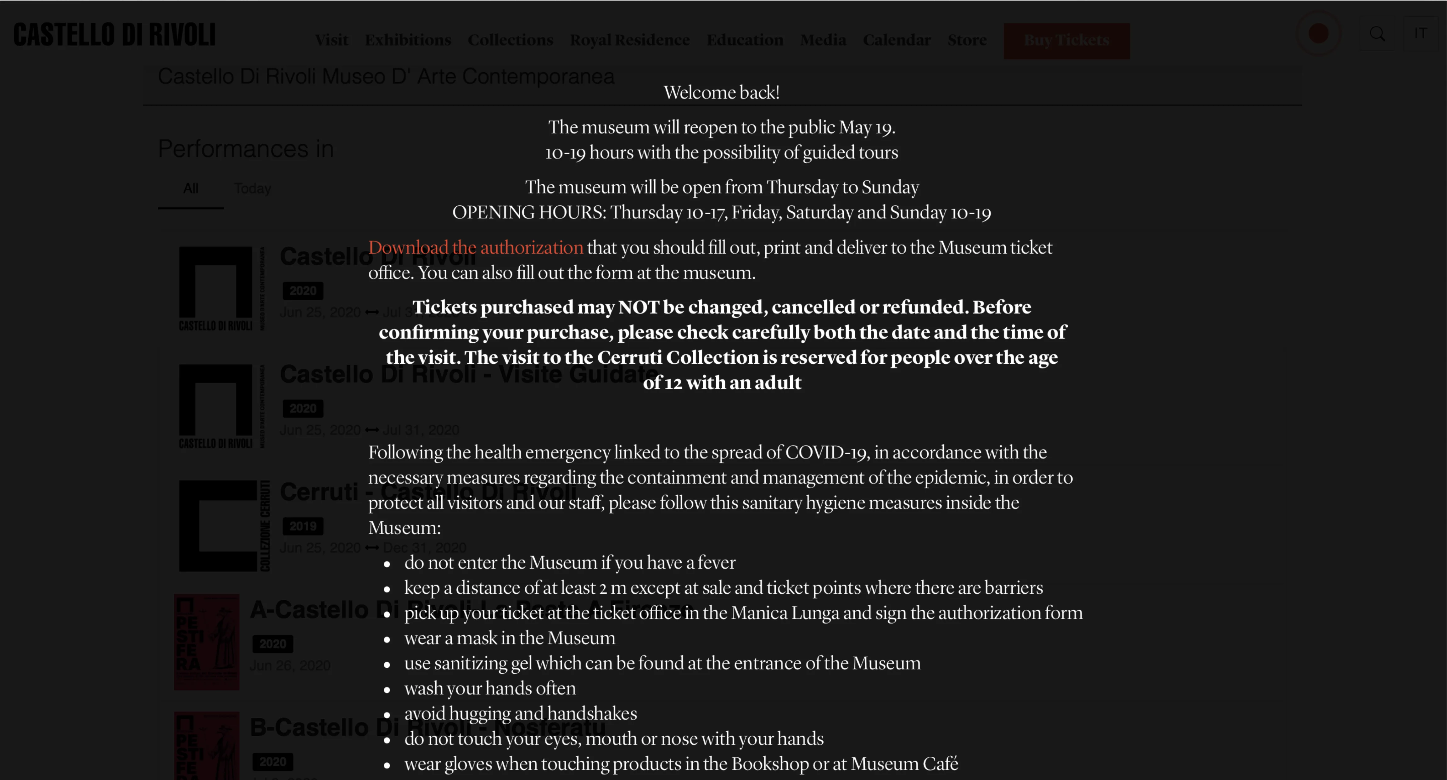 If, for example, you visit the Barrington website, miss the carousel item, and start buying tickets, the information is linked again next to the seat picker. The Castello di Rivoli in Turin takes an even more aggressive approach, presenting users with a pop-up message listing all their COVID policies as soon as you click "Buy Tickets". This message must be actively dismissed before you can continue. Like the link on Barrington's seat picker, the idea is presumably that this will ensure anyone visiting the venue is informed before they purchase.