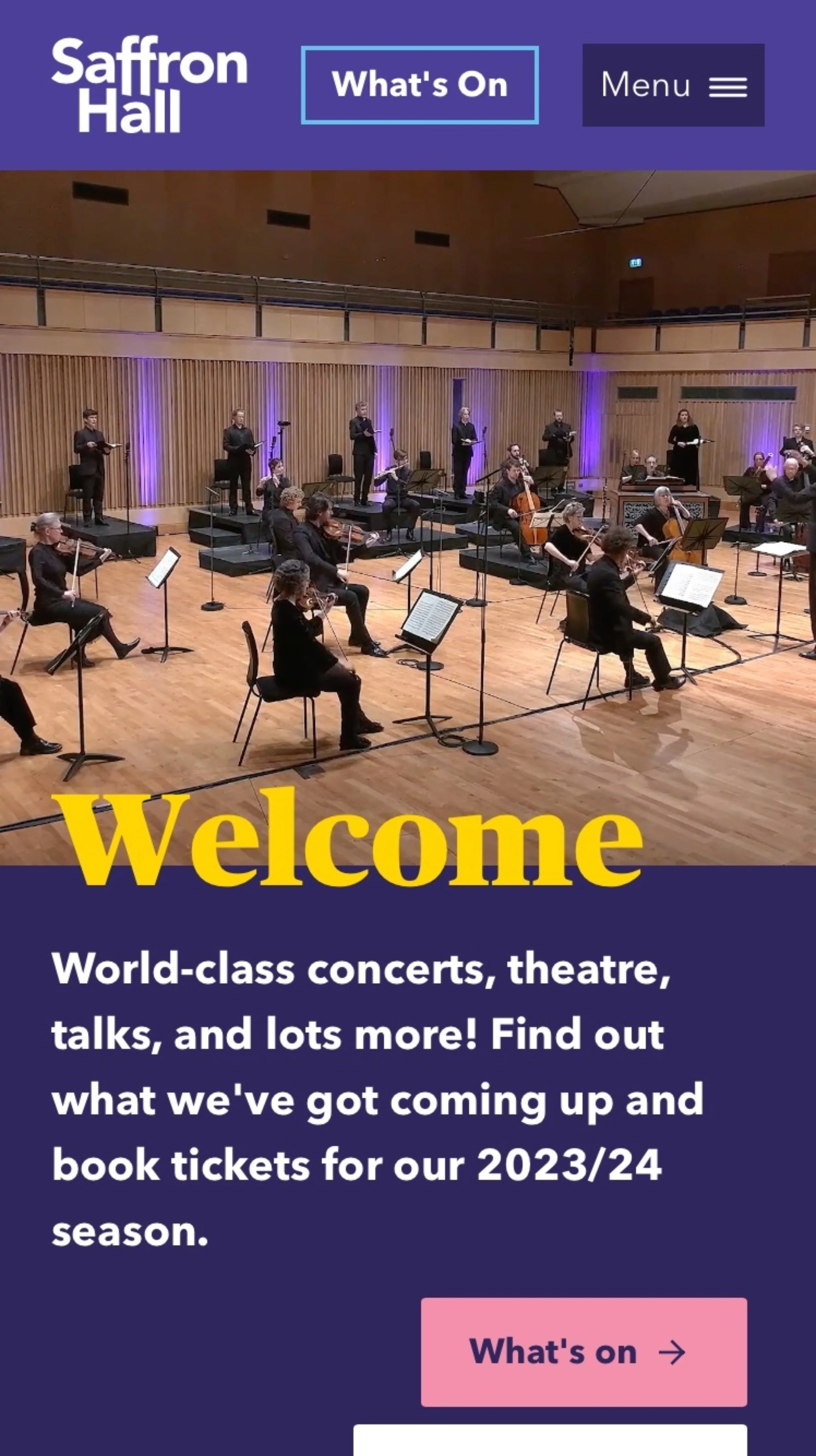 Consider the website we built for Saffron Hall. Throughout our discovery research, it became clear that the most important thing users needed to be able to do was browse the programme and book tickets. So the “What’s On” link in the navigation has an underline to make it stand out more — and when you drop down to a smaller screen, “What’s On” becomes the only link that’s not hidden inside the mobile navigation menu. Most of the time, there’s also a link to “What’s On” in the site hero section.